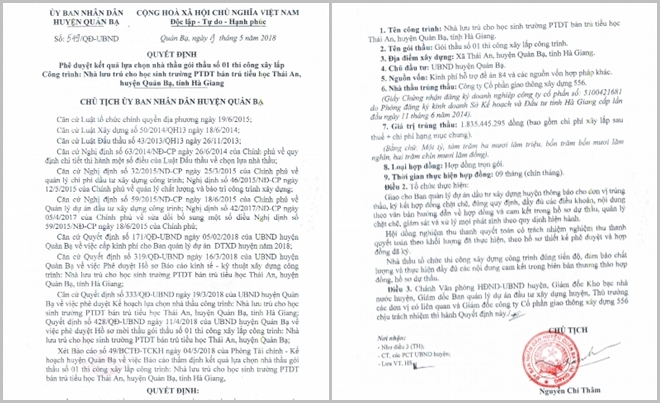 Ngày 17/9/2018, kết thúc quá trình lựa chọn nhà thầu, UBND huyện Quản Bạ ra quyết định phê duyệt (QĐPD) kết quả lựa chọn số 1228/QĐ-UBND cho gói thầu Thi công xây lắp công trình (gồm Chi phí xây dựng, chi phí HMC và dự phòng).