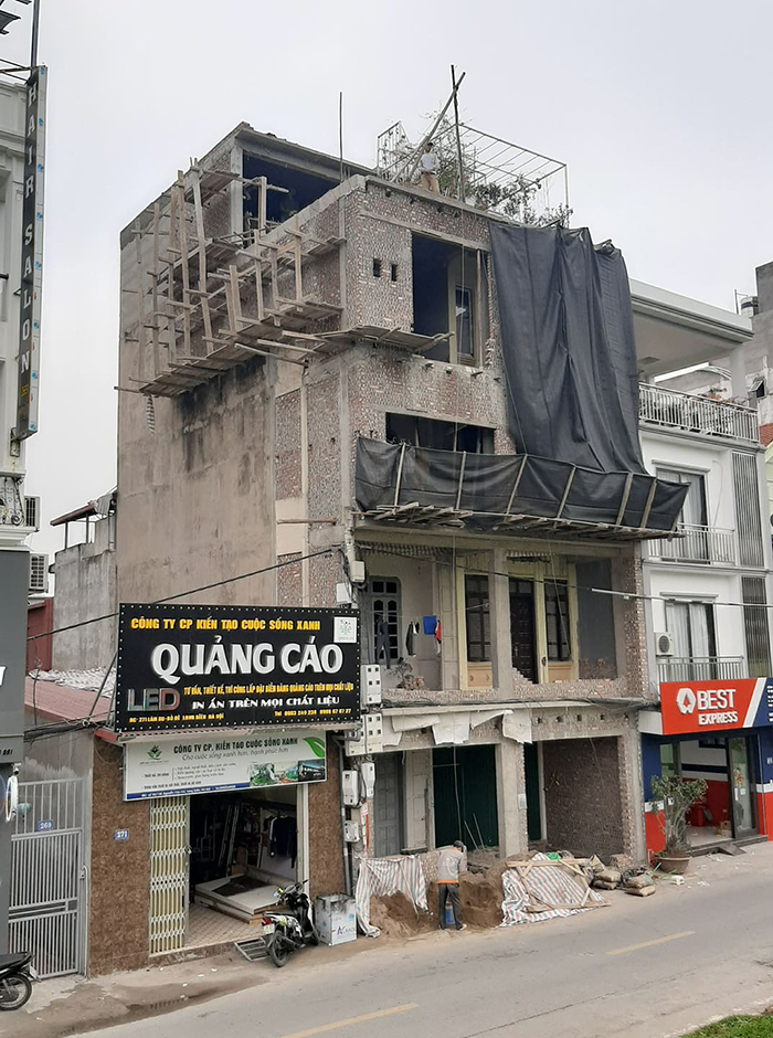 Cũng thuộc phường Bồ Đề, công trình tại số 273 Lâm Du được chủ đầu tư cơi nới phần mặt tiền ngôi nhà ra phía ngoài đường, biến ban công các tầng thành không gian phòng và tum thang mở rộng thêm.