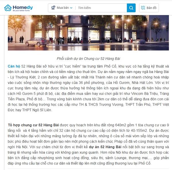 Trên các trang quảng cáo về bất động sản, công trình tại số 52 Hàng Bài - Hoàn Kiếm - Hà Nội được giới thiệu là Sở hữu vị trí đất vàng, là tổ hợp chung cư do tập đoàn T&T triển khai với thiết kế hiện đại. Với vị trí vô cùng trung tâm “Một bước tới hồ Gươm – Thức giấc cùng Phố Cổ”- dự án sẽ mang đến không gian sống đẳng cấp và thượng lưu bậc nhất thủ đô.