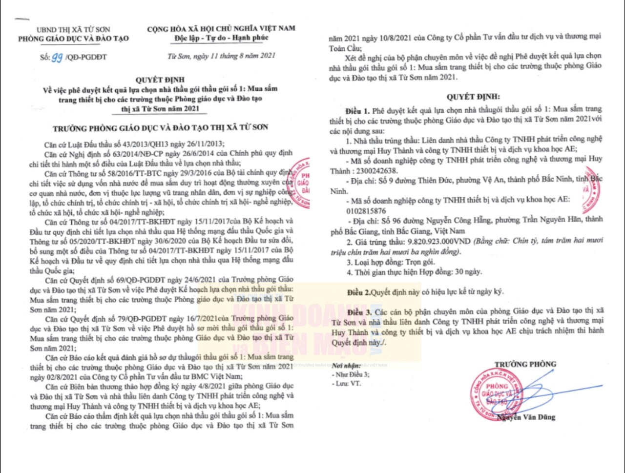 Đơn cử như tháng 8/2021 tại gói thầu số 1: Mua sắm trang thiết bị cho các trường thuộc phòng giáo dục và Đào tạo thị xã Từ Sơn năm 2021, liên danh Công ty Huy Thành và Công ty TNHH thiết bị và dịch vụ khoa học AE được phê duyệt trúng thầu với giá 9.820.923.000 đồng (giá gói thầu 9.921.000.000 đồng) theo Quyết định số 99/QĐ-PGDĐT ngày 11/08/2021 do ông Nguyễn Văn Dũng - Trưởng Phòng Giáo dục và Đào tạo thị xã Từ Sơn ký.